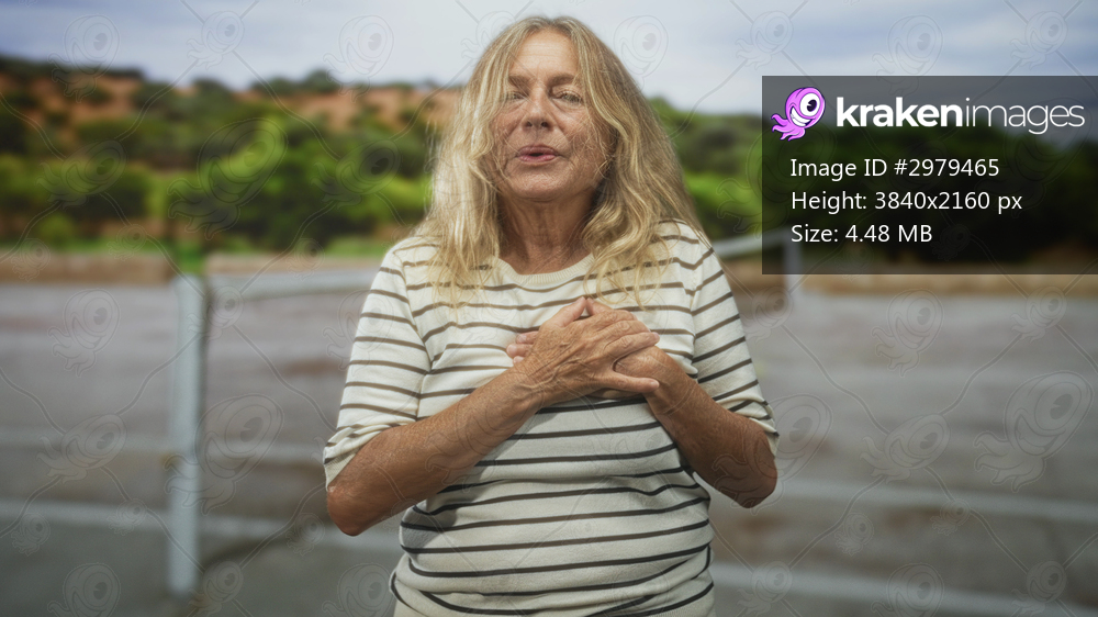 Senior woman clutching chest with both hands on street in striped shirt and loose blonde hair, eyes closed, possible heartattack gesture; relief.