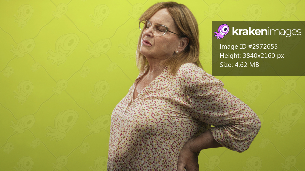 Senior woman clutching lower back with hand, grimacing in pain, wearing glasses and a floral blouse against a green studio backdrop; discomfort resilience. - Kraken Images