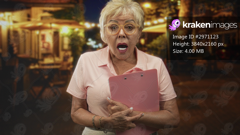 Senior woman clutching pink clipboard with open mouth gesture on a night street; surprise curiosity.