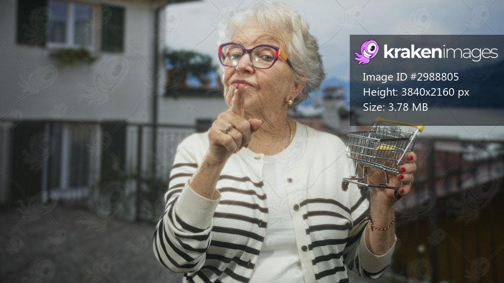 Senior woman with colorful glasses holding a miniature shopping cart, finger to lips for silence in building balcony by lake; secrecy hush.