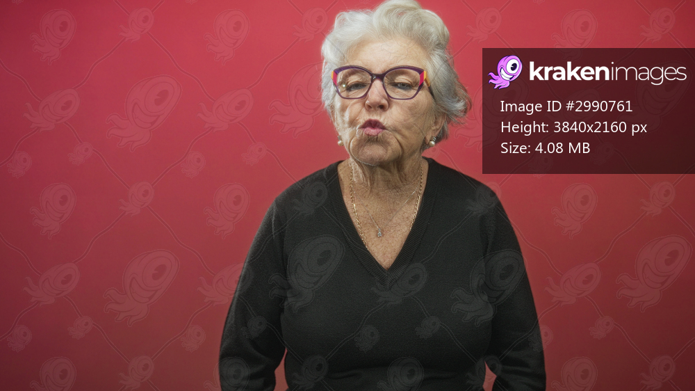 Senior woman with colorful glasses puckers lips and smiles in studio with red backdrop; playfulness warmth.