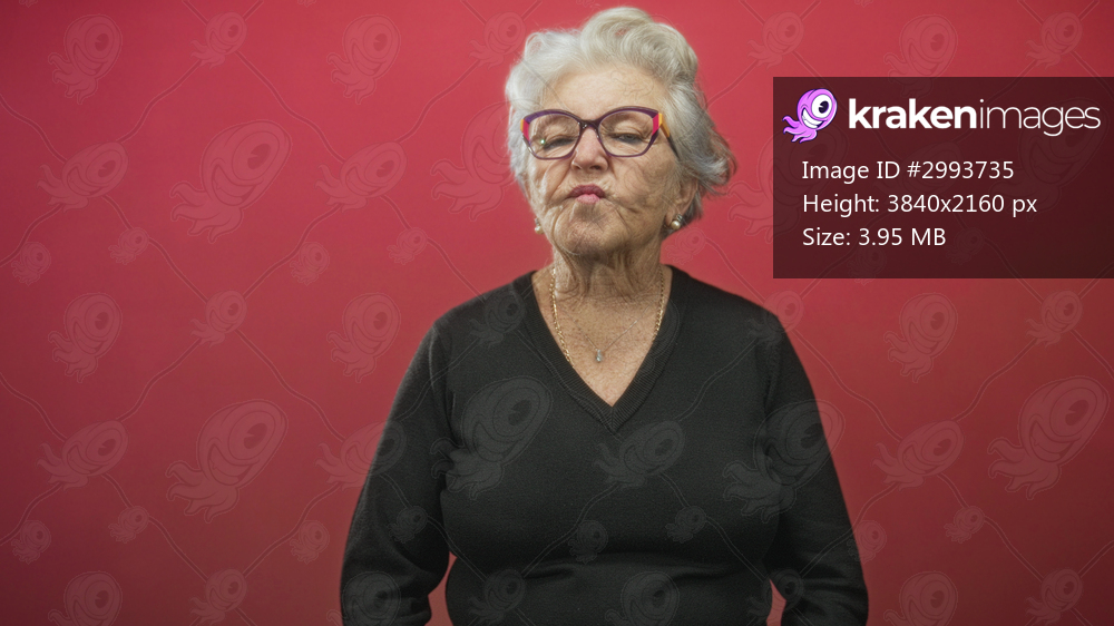 Senior woman with colorful glasses puckers lips and smiles in studio with red backdrop; playfulness warmth.