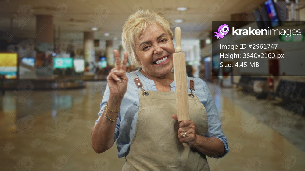 Senior woman cook in apron holds a rolling pin and holds up two fingers in an airport terminal building; happiness tradition warmth.