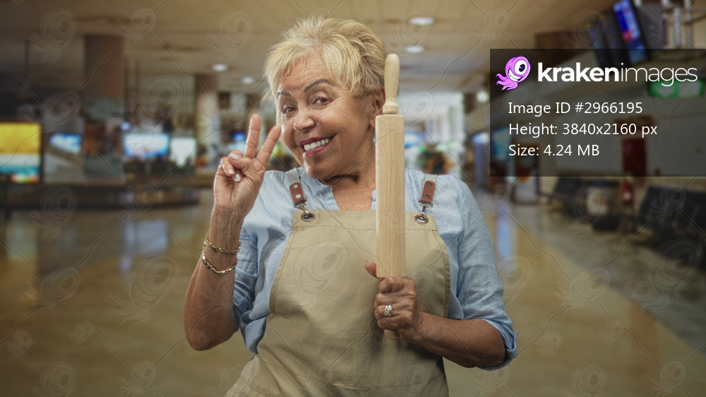 Senior woman cook in apron holds a rolling pin and holds up two fingers in an airport terminal building; happiness tradition warmth.