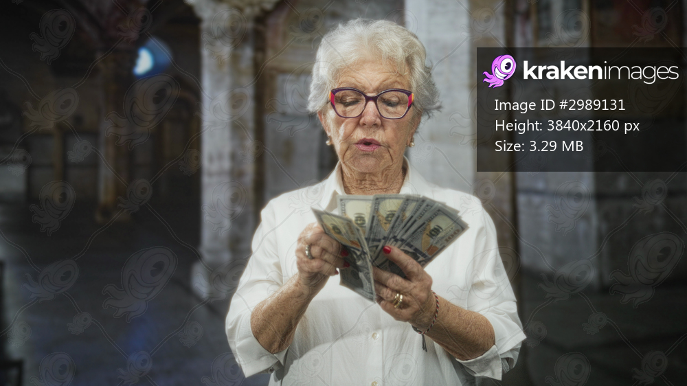 Senior woman counting banknotes and holding cash with visible hands in a stone building; surprise security.