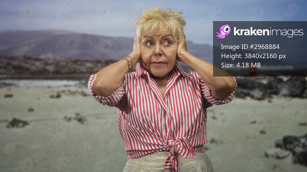 Senior woman covers ears with hands at a rocky beach, wearing red striped shirt tied at waist with bracelets and rings, short blonde hair and a pained look; annoyed solitude. - Kraken Images