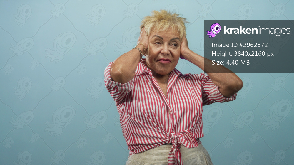 Senior woman covers ears with hands in studio wearing red striped shirt tied at waist and bracelets; discomfort.