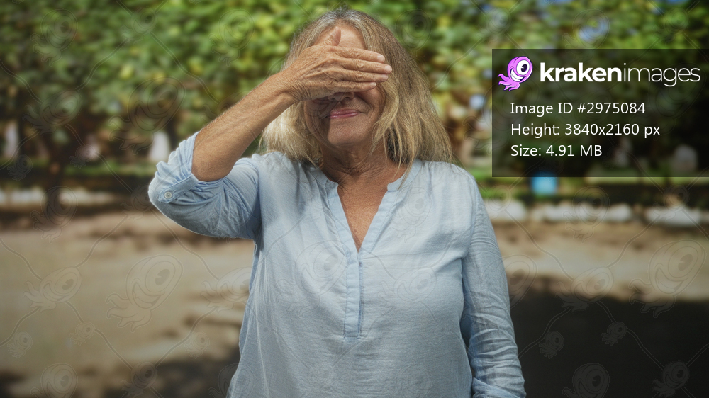 Senior woman covers eyes with hand while smiling, bare hand raised in forest backdrop, relaxed posture and pale blue blouse; playful contentment.