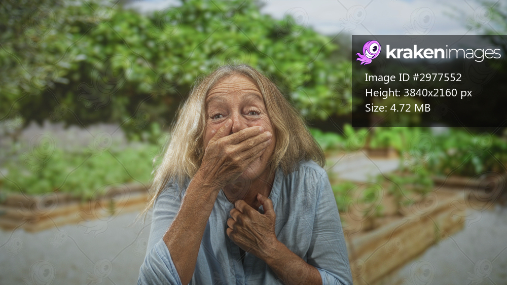 Senior woman covers mouth with hand and clutches chest for heartattack among raised planters in a forest garden; surprise concern.