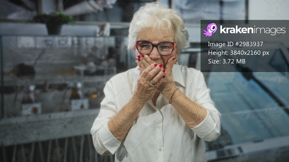 Senior woman covers mouth with hands in modern airport terminal, white blouse and red nail polish visible, eyeglasses; surprise vulnerability.