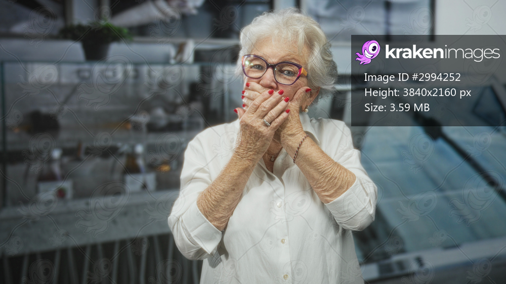 Senior woman covers mouth with hands in modern airport terminal, white blouse and red nail polish visible, eyeglasses; surprise vulnerability.