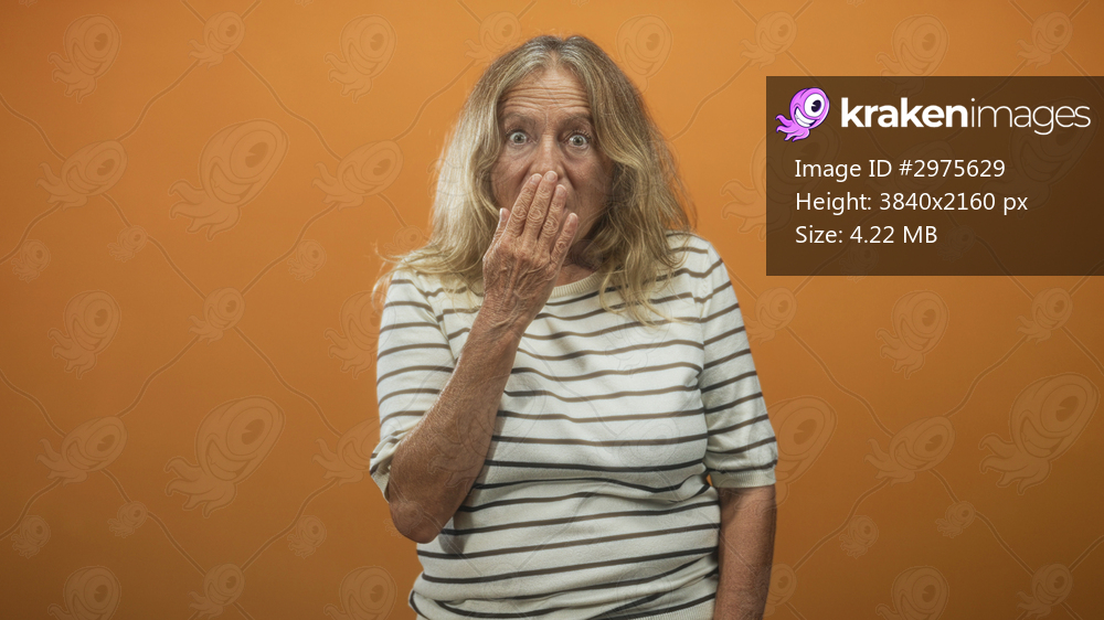 Senior woman covers nose with hand in orange studio wearing striped shirt, eyes wide and hand to face gesture; disgust concern unease.