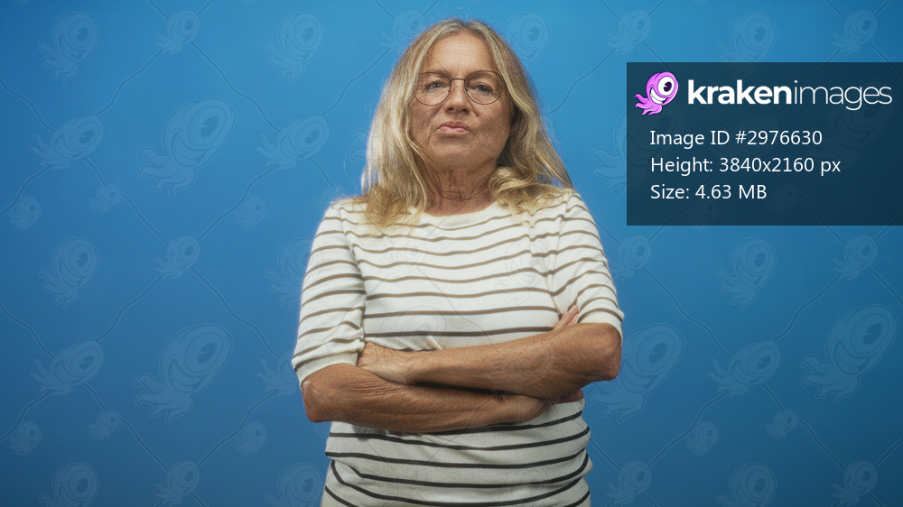 Senior woman with crossed arms showing forearms, standing in a blue studio backdrop; confidence resolve.