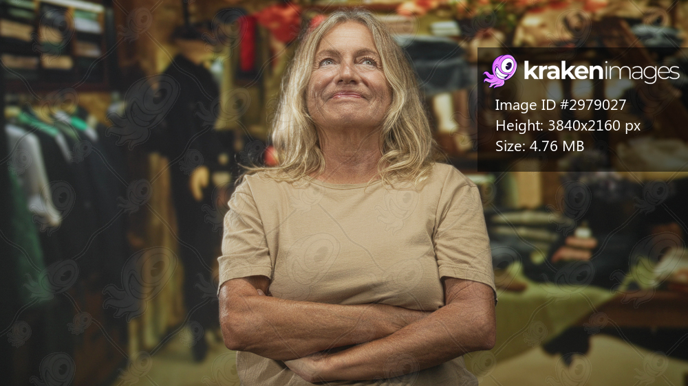 Senior woman with crossed arms and visible forearms in a clothing store inside a building; confidence resilience.