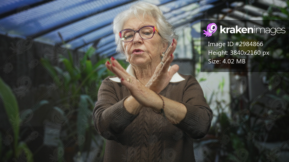 Senior woman crosses forearms in an x, showing palms and a dismissive gesture amid potted plants inside a glass greenhouse building; rejection.