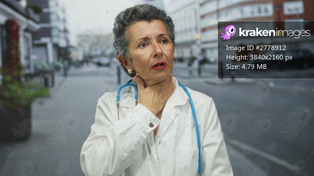 Senior woman doctor coughing on urban street, wearing stethoscope and white coat, displaying symptoms outdoors in a city environment, suggesting professional health issues. - Kraken Images