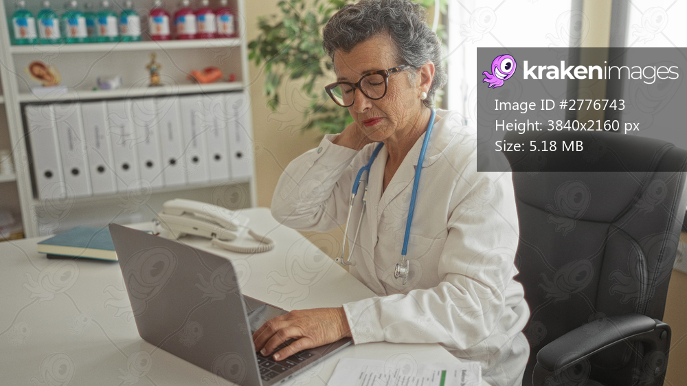 Senior woman doctor with grey hair at clinic office working on laptop and feeling neck pain, showcasing healthcare challenges and professional dedication. - Kraken Images