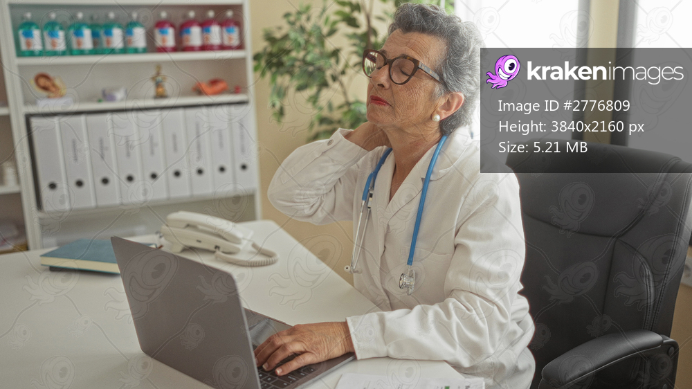 Senior woman doctor with grey hair at clinic office working on laptop and feeling neck pain, showcasing healthcare challenges and professional dedication. - Kraken Images
