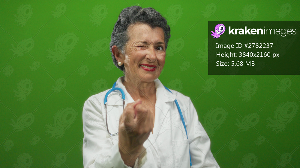 Senior woman doctor with grey hair gesturing come here and winking, wearing a coat and stethoscope against a green background.