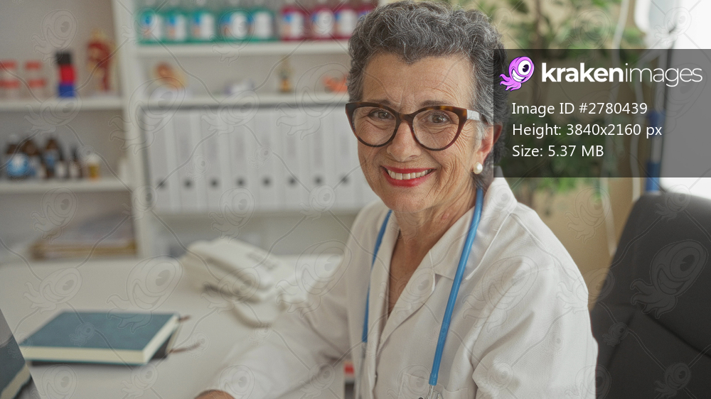 Senior woman doctor with grey hair and glasses sits in office wearing a white coat and stethoscope surrounded by medical supplies and files.