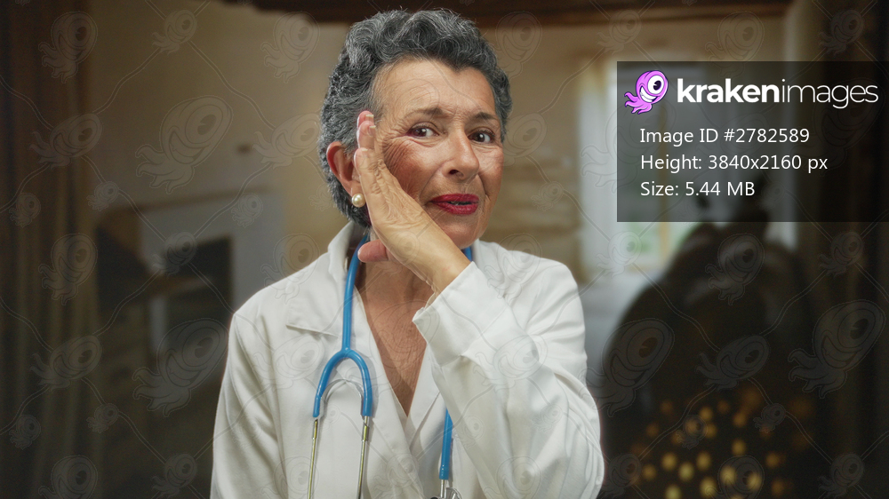 Senior woman doctor with grey hair in a coat and stethoscope gestures as if telling a secret in an indoor room setting, creating a friendly and engaging atmosphere. - Kraken Images