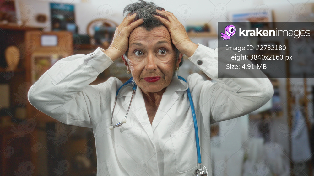 Senior woman doctor with grey hair in a white coat and stethoscope looks surprised indoors, emphasizing healthcare and emotion in a professional setting. - Kraken Images