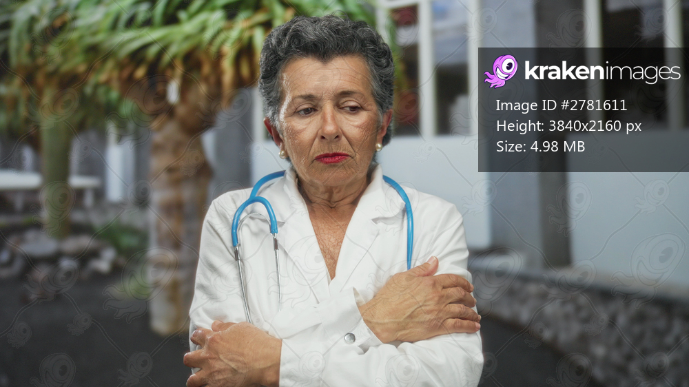 Senior woman doctor with grey hair in a white coat and stethoscope stands thoughtfully on an urban street, embodying a moment of concentration and reflection. - Kraken Images
