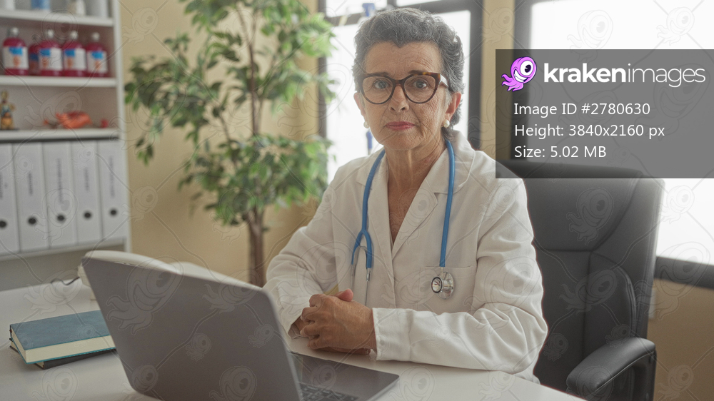 Senior woman doctor with grey hair sitting seriously with crossed arms in modern clinic office using laptop and wearing stethoscope around her neck.
