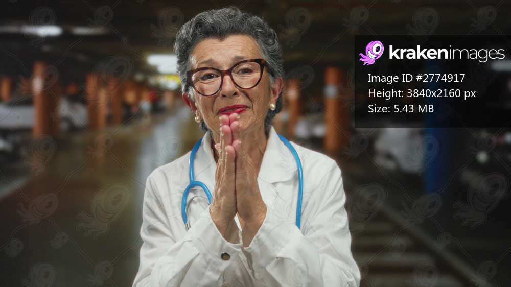 Senior woman doctor with grey hair and stethoscope in an indoor parking lot, smiling with hands clasped, wearing glasses and white coat, conveying empathy and care. - Kraken Images