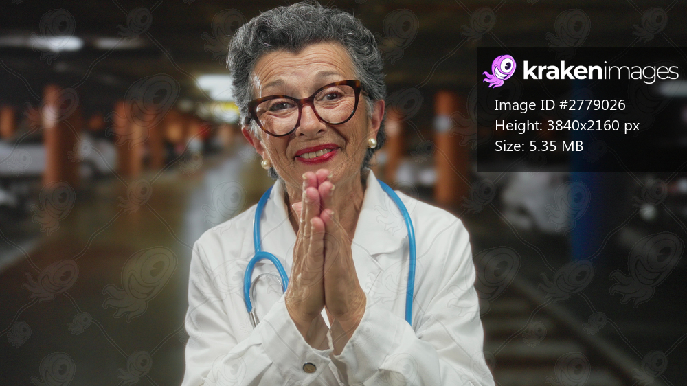 Senior woman doctor with grey hair and stethoscope in an indoor parking lot, smiling with hands clasped, wearing glasses and white coat, conveying empathy and care. - Kraken Images