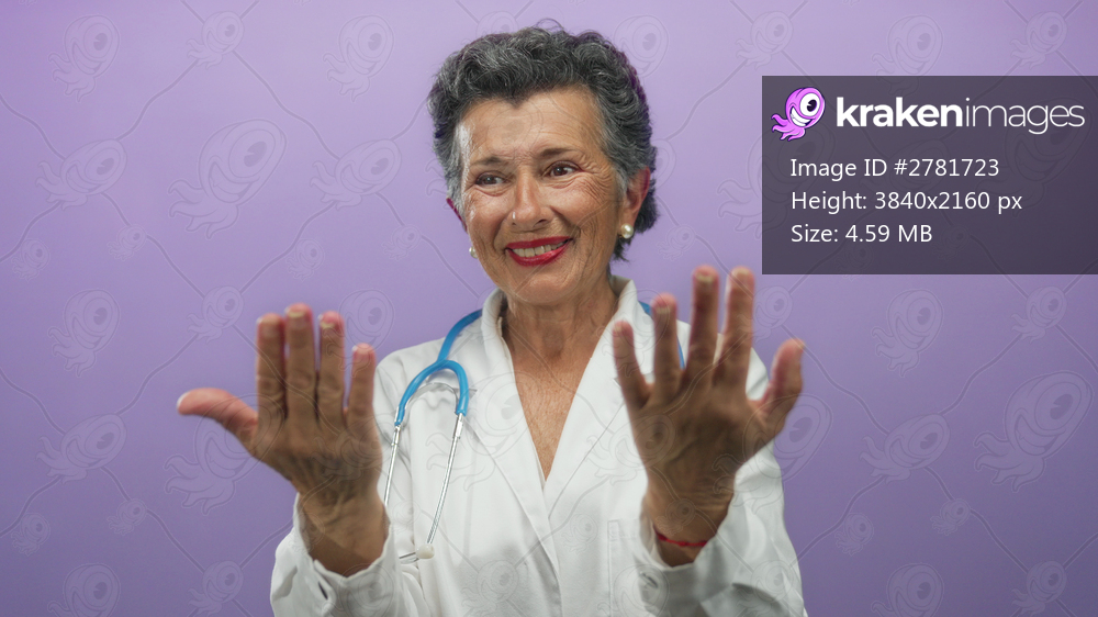 Senior woman doctor with grey hair and stethoscope making a come here gesture against a purple background.