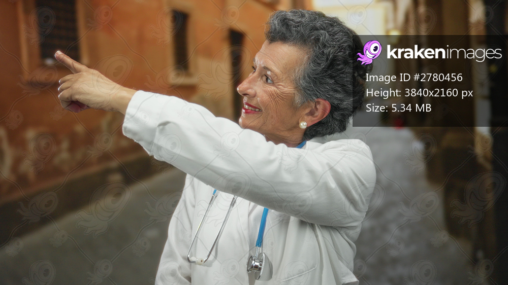Senior woman doctor with grey hair and stethoscope points while standing in an old town urban street outdoors, exuding confidence and wisdom in a bustling city setting. - Kraken Images