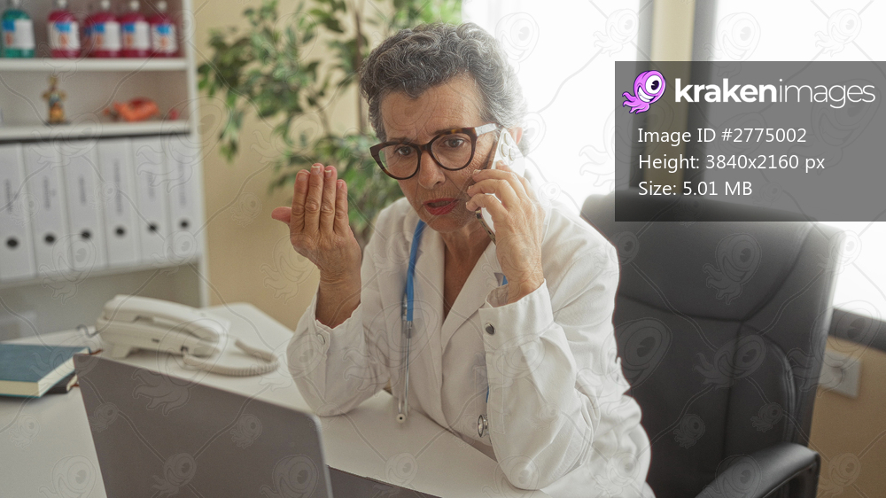 Senior woman doctor with grey hair talking on phone in clinic office surrounded by medical equipment and files.