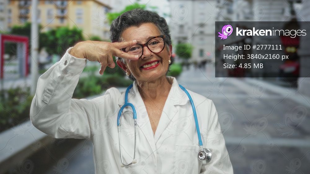 Senior woman doctor with grey hair wearing a coat and stethoscope makes a victory gesture in an urban street, smiling confidently outdoors in a lively town setting. - Kraken Images