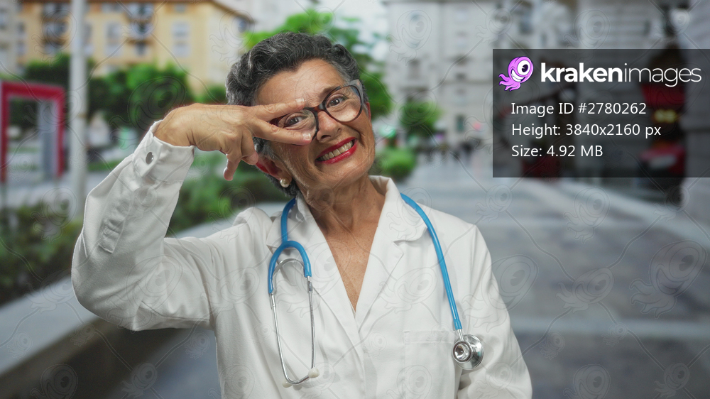 Senior woman doctor with grey hair wearing a coat and stethoscope makes a victory gesture in an urban street, smiling confidently outdoors in a lively town setting. - Kraken Images