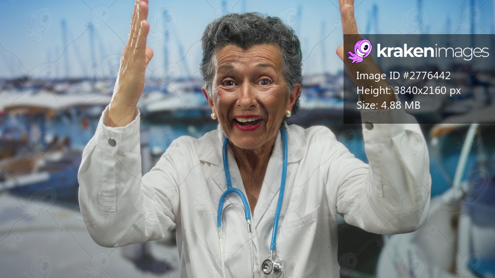 Senior woman doctor with grey hair wearing a stethoscope gestures expressively at a seaside port with boats, capturing a lively scene by the sea.