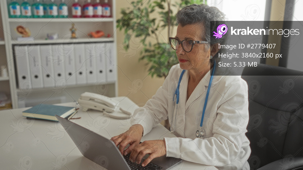 Senior woman doctor with grey hair working on laptop in a clinic office, showcasing a professional medical environment with focus on healthcare activities. - Kraken Images