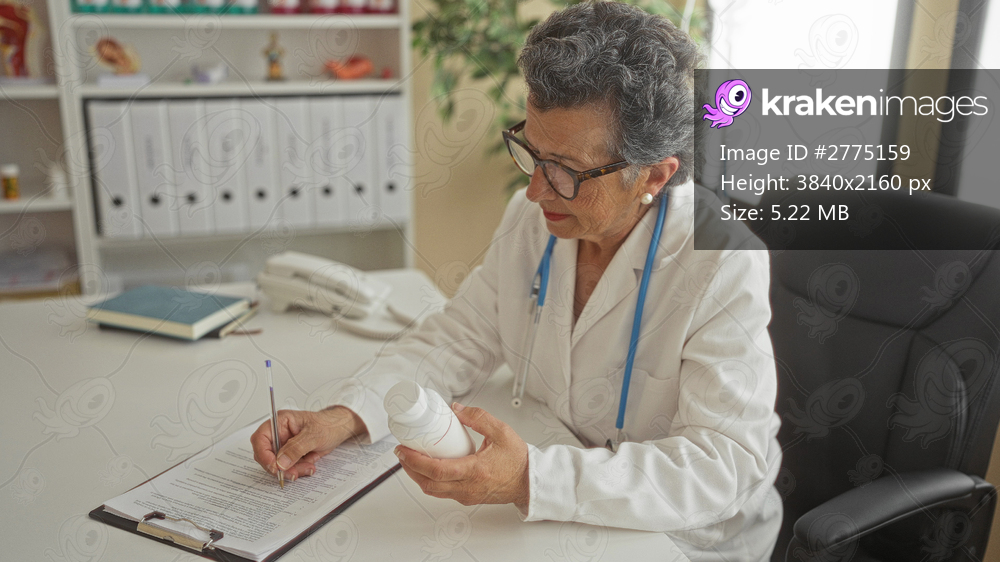 Senior woman doctor with grey hair writing in a clinic office, examining medication bottle with focus and care, surrounded by office supplies and medical equipment. - Kraken Images