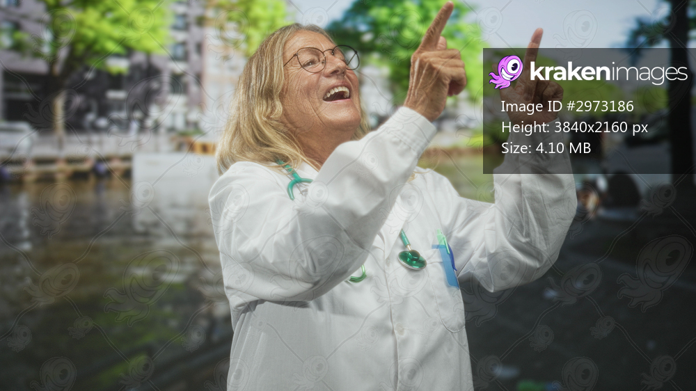 Senior woman doctor in coat with stethoscope pointing both index fingers upward on a street by a canal; compassionate care joy.