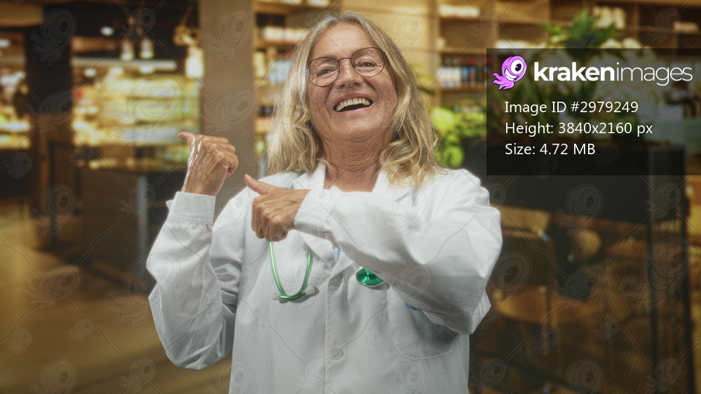 Senior woman doctor in lab coat with stethoscope smiling, pointing and adjusting her sleeve in building aisle; calm confidence.