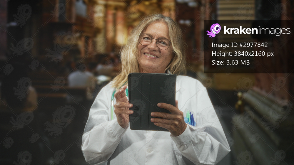 Senior woman doctor in labcoat and stethoscope taps a tablet with her hands and smiles in a building while reviewing notes; serenity.