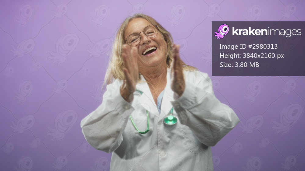 Senior woman doctor in white coat clapping hands with green stethoscope visible in studio; joy celebration.