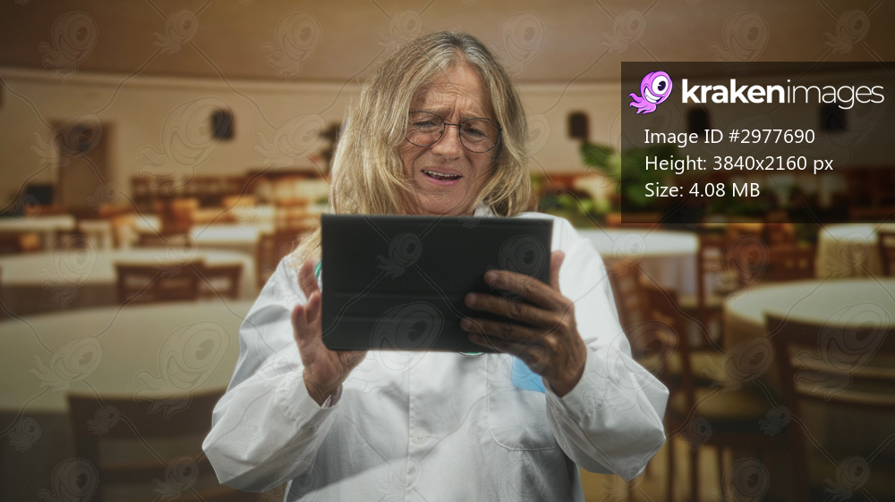 Senior woman doctor in white coat holds tablet with both hands, mouth open in surprise while standing in a dining hall building; surprise discovery.