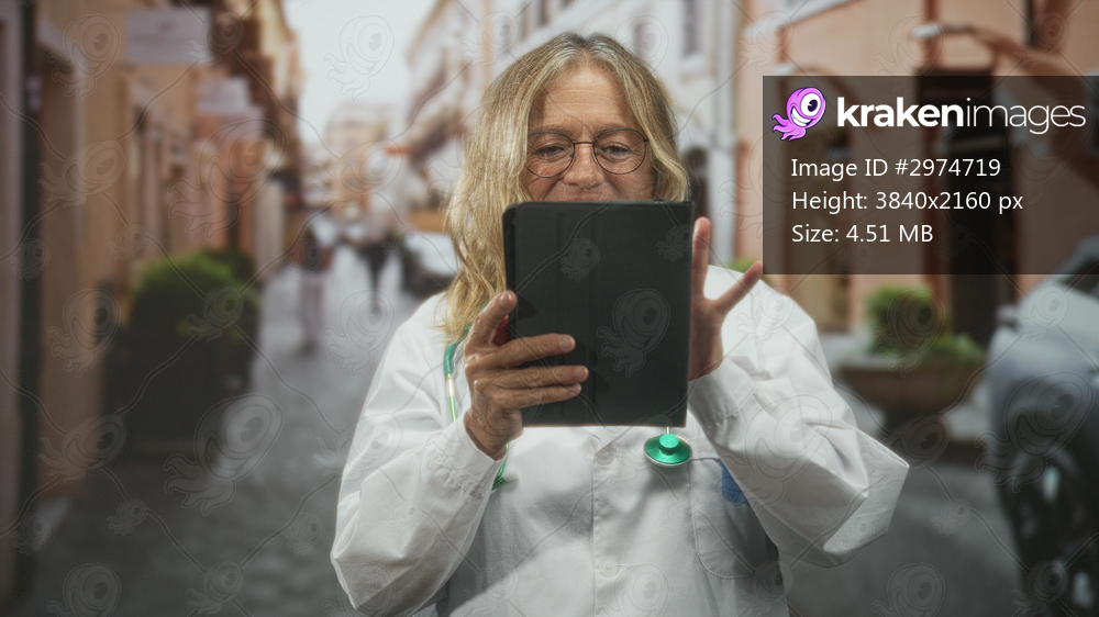 Senior woman doctor in white coat holds tablet with both hands and taps screen while standing on a narrow cobblestone street; digital care focus.