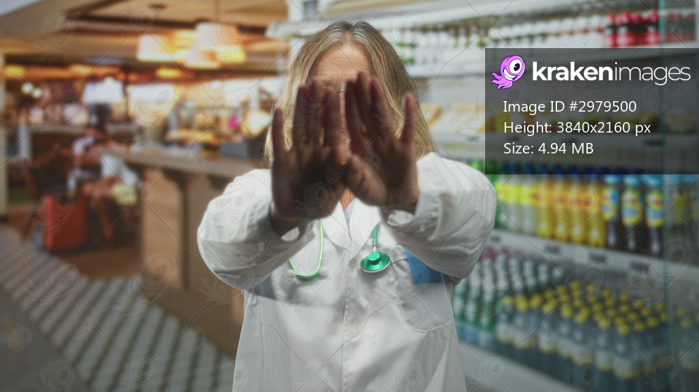 Senior woman doctor in white coat with stethoscope holds hands palms out toward camera in a store building; calm compassion.