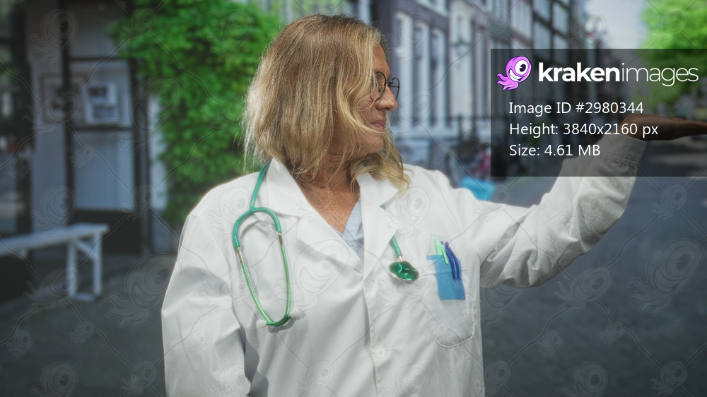 Senior woman doctor in white coat with stethoscope holds palm up in a presenting gesture on street; calm compassion.