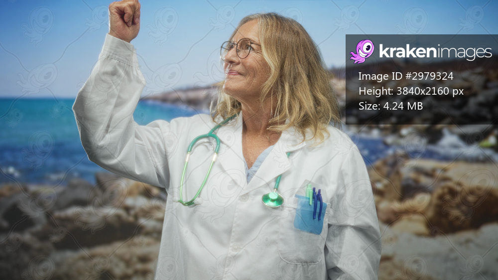 Senior woman doctor in white coat with stethoscope points finger upward beside rocky beach in studio; confidence compassion care.