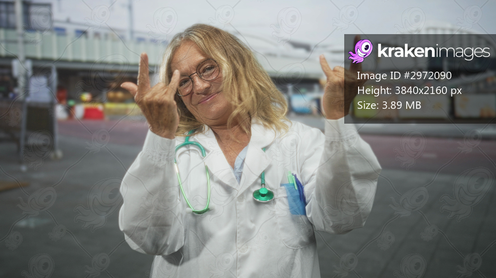 Senior woman doctor in white coat with stethoscope shows rock horns with both hands on street; playful defiance.