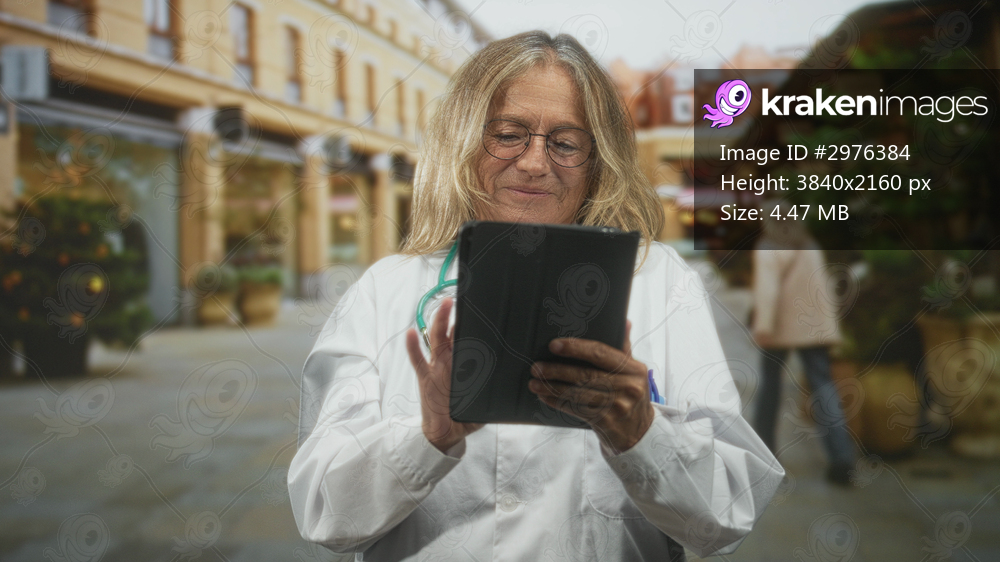 Senior woman doctor in white coat taps tablet with fingers on a pedestrian street shopping arcade; community care confidence.