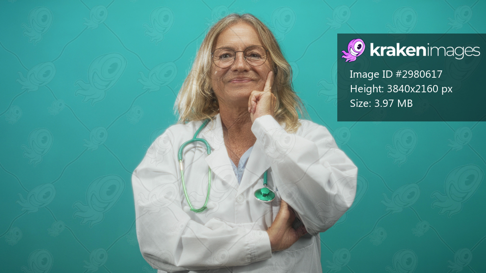 Senior woman doctor in white lab coat with green stethoscope and glasses touches chin with finger and holds arms crossed, looking aside in studio; thoughtful expertise. - Kraken Images